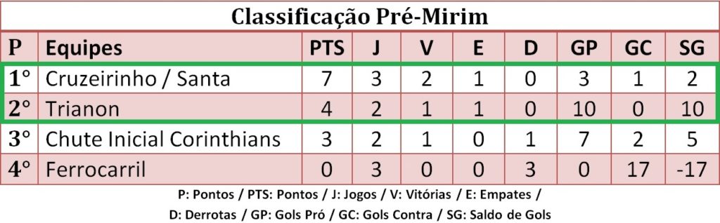 Marca Verde: faixa dos classificados para as finais do Campeonato Amador Pré-Mirim