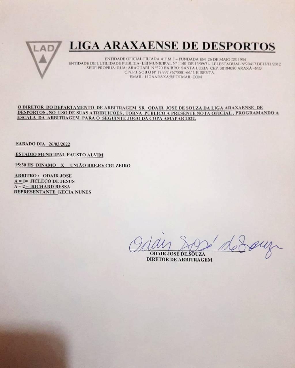 A Liga Araxaense de Desportos (LAD) definiu a escala da arbitragem para o jogo Dínamo x União Brejo Cruzeiro, neste sábado, 26 de março, pela sexta rodada da Copa Regional Amapar e das seis partidas que completam a rodada de ida da Copa Araxá 2022. Confira: