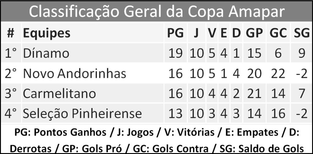 O Dínamo venceu por 1 a 0 e vai enfrentar a Seleção Pinheirense em uma das semifinais da Copa Regional Amapar. Carmelitano e Novo Andorinhas são os outros classificados e fazem também o duelo da fase semifinal.