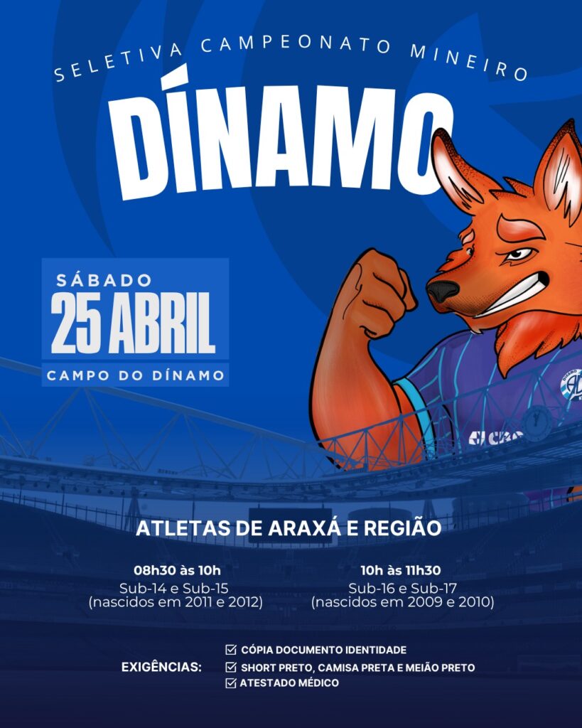 A Associação Esportiva Dínamo Esporte Clube realiza, neste sábado (25), a seletiva de atletas para as categorias de base Sub-15 e Sub-17, visando a formação das equipes para a temporada de 2026. O clube representa Araxá na 2ª divisão do Campeonato Mineiro nas categorias de base e busca novos talentos da cidade e região.