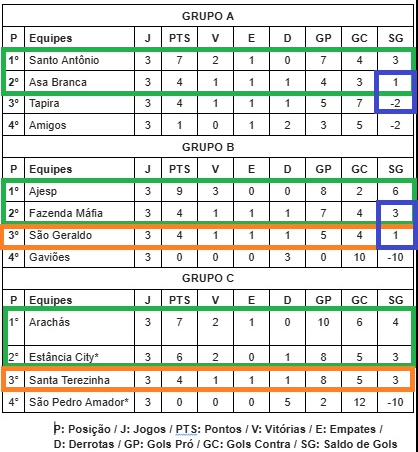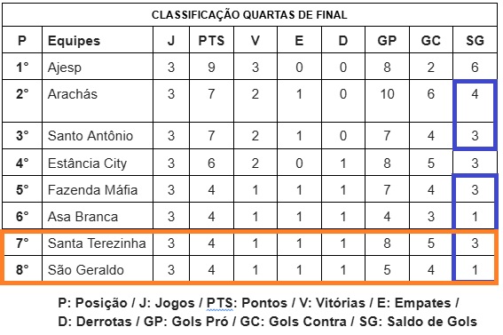 As equipes que se enfrentaram neste domingo voltam a se encarar nas quartas de final. Os demais jogos da próxima fase são: Arachás x Santa Terezinha, Estância x Fazenda Máfia e Santo Antônio x Asa Branca. Como Santa Terezinha e São Geraldo avançaram como os dois melhores terceiros colocados, a organização considerou a classificação geral, posicionando-os em 7º e 8º lugares.