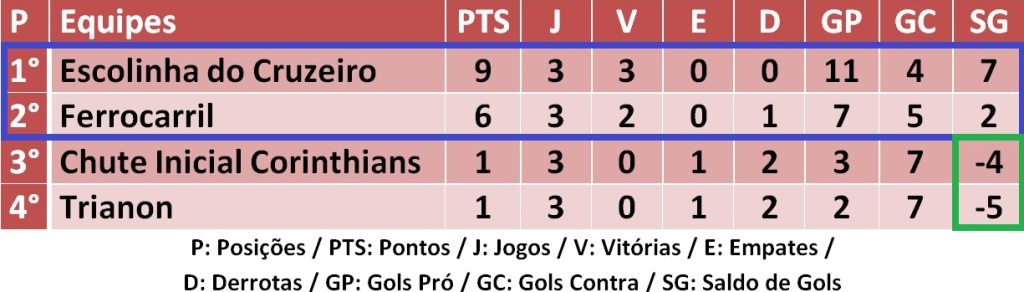 Estádio Santa Terezinha: Escolinha do Cruzeiro 3×1 Chute Inicial Corinthians, com gols de Guilherme, Bruno Iwanov e Antônio (Escolinha do Cruzeiro) e Diego (Chute Inicial Corinthians)