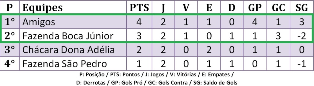 19h30 – Amigos x Fazenda São Pedro – com empate, o Amigos está garantido na final e, se também vencer. Dos quatro times, a situação da Fazenda São Pedro porque torce por combinação de resultados que vai de empate do jogo de terça, combinado de vitória da equipe alvinegra para obter a classificação, até mesmo no saldo de gols