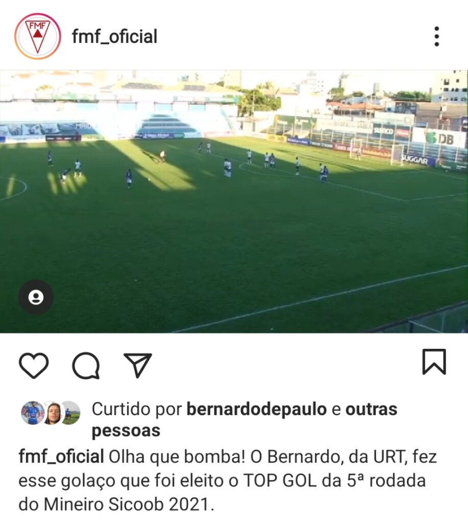 Frequentemente, a Federação Mineira de Futebol (FMF) elege o TOP GOL INTERIOR ao final de cada rodada do Campeonato Mineiro no canal do Instagram . O gol de Bernardo foi eleito como o mais TOP da 5ª rodada. Ele cobrou falta aos 41 minutos do segundo tempo e bateu forte na bola acertando o canto esquerdo do goleiro adversário.