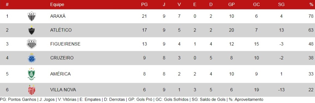Araxá, 21 pontos (1°), Atlético, 17 pontos (2°), Figueirense, 13 pontos (3°), Cruzeiro, 9 pontos (4°), América, 8 pontos (5°), e Villa Nova, 6 pontos (6°). Essa é a classificação do hexagonal que irá para o cumprimento da tabela só para definir as colocações finais de Figueirense, Cruzeiro, América e Villa Nova. Araxá e Atlético terminam o hexagonal nessas mesmas posições atualmente ocupadas.