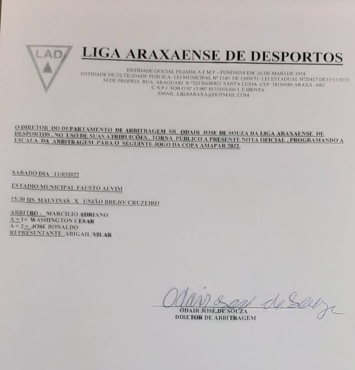 A Liga Araxaense de Desportos (LAD) definiu a arbitragem para o jogo Malvinas x União Brejo / Cruzeiro neste sábado, 12 de março. O alviverde de Araxá vai jogar com o time de Cruzeiro da Fortaleza, às 15h30, no Estádio Municipal Fausto Alvim, com total cobertura da Equipe Na Batida do Esporte.