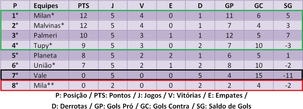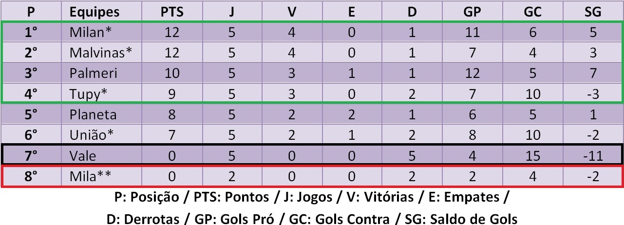 *: Equipes que ganharam 3 pontos automaticamente vencendo o Mila por 2 a 1, decisão da LAD