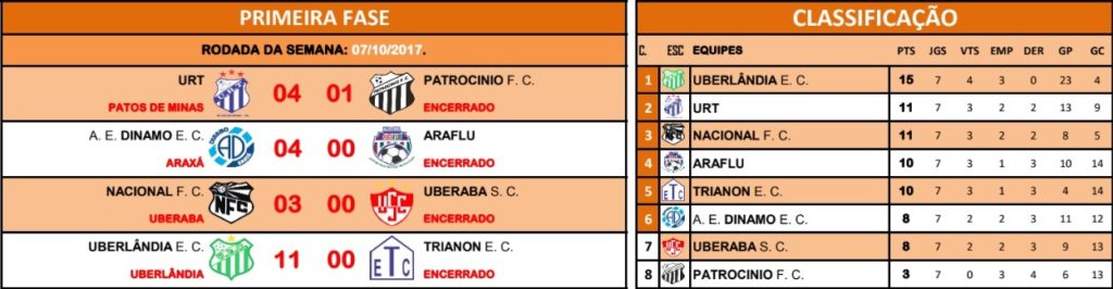 São formados dois grupos de três equipes sendo que Uberlândia, URT e Trianon enfrentam Nacional, Araflu e Dínamo formalizando assim, os confrontos de um grupo contra outro grupo. A tabela da segunda fase será definida durante a semana pela Liga Uberlandense de Futebol (LUF) e comunicada aos seis clubes participantes:
