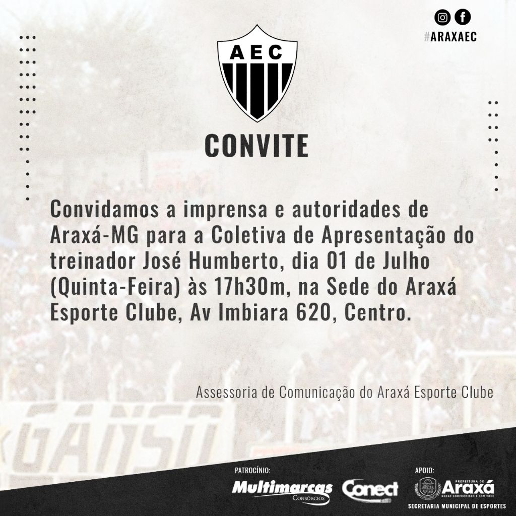 A Equipe Na Batida do Esporte estará presente na apresentação e vai repercutir a coletiva do novo treinador do Araxá. O evento vai seguir todos os protocolos exigidos de prevenção a Covid-19 com uso de máscara obrigatório para acessar o local, disponibilização de álcool em gel e respeito ao distanciamento social.