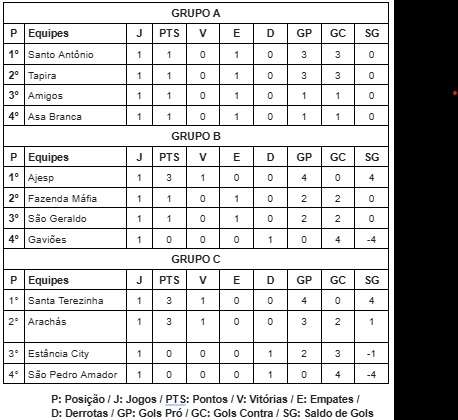 A rodada inaugural do Grupo A do Torneio Ronan Ferreira da Costa terminou com equilíbrio entre as equipes. Após o empate em 3 a 3 entre Santo Antônio e Tapira, mais uma partida sem vencedor foi registrada nesta semana, deixando todos os times do grupo com a mesma pontuação.